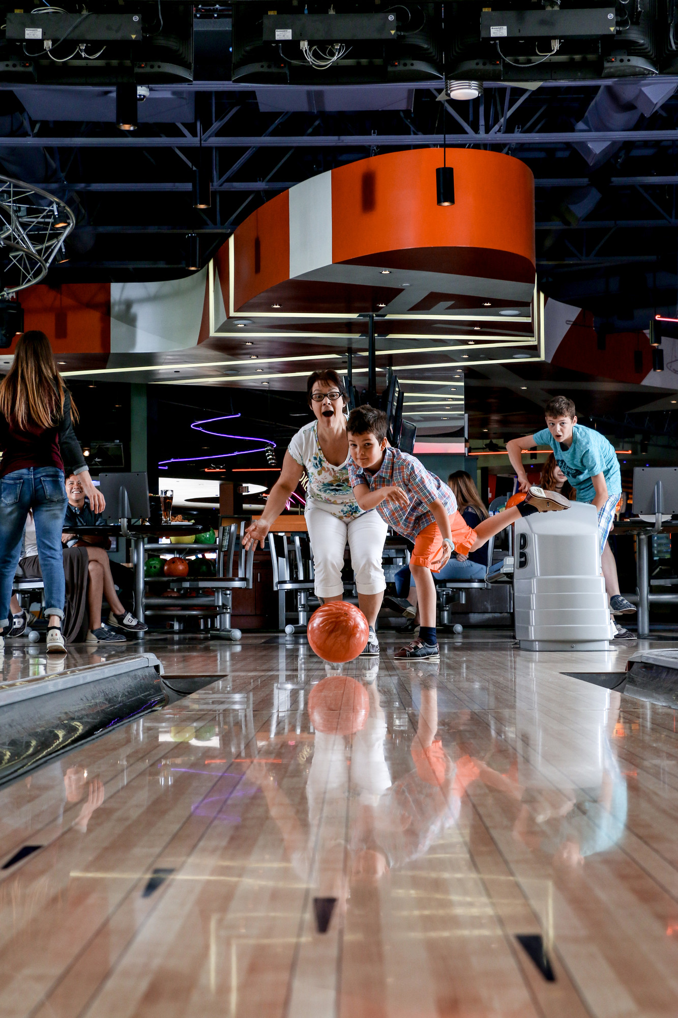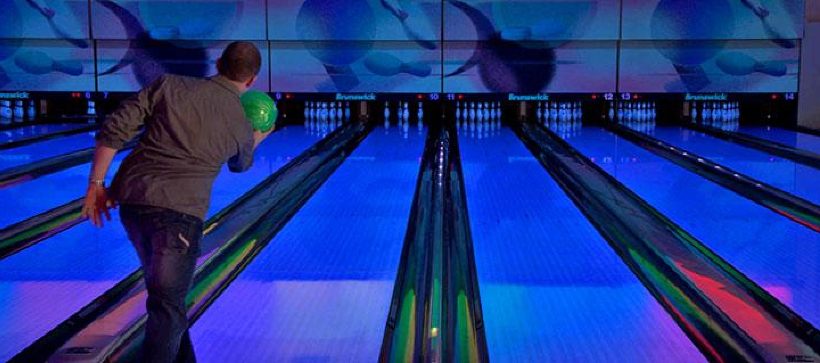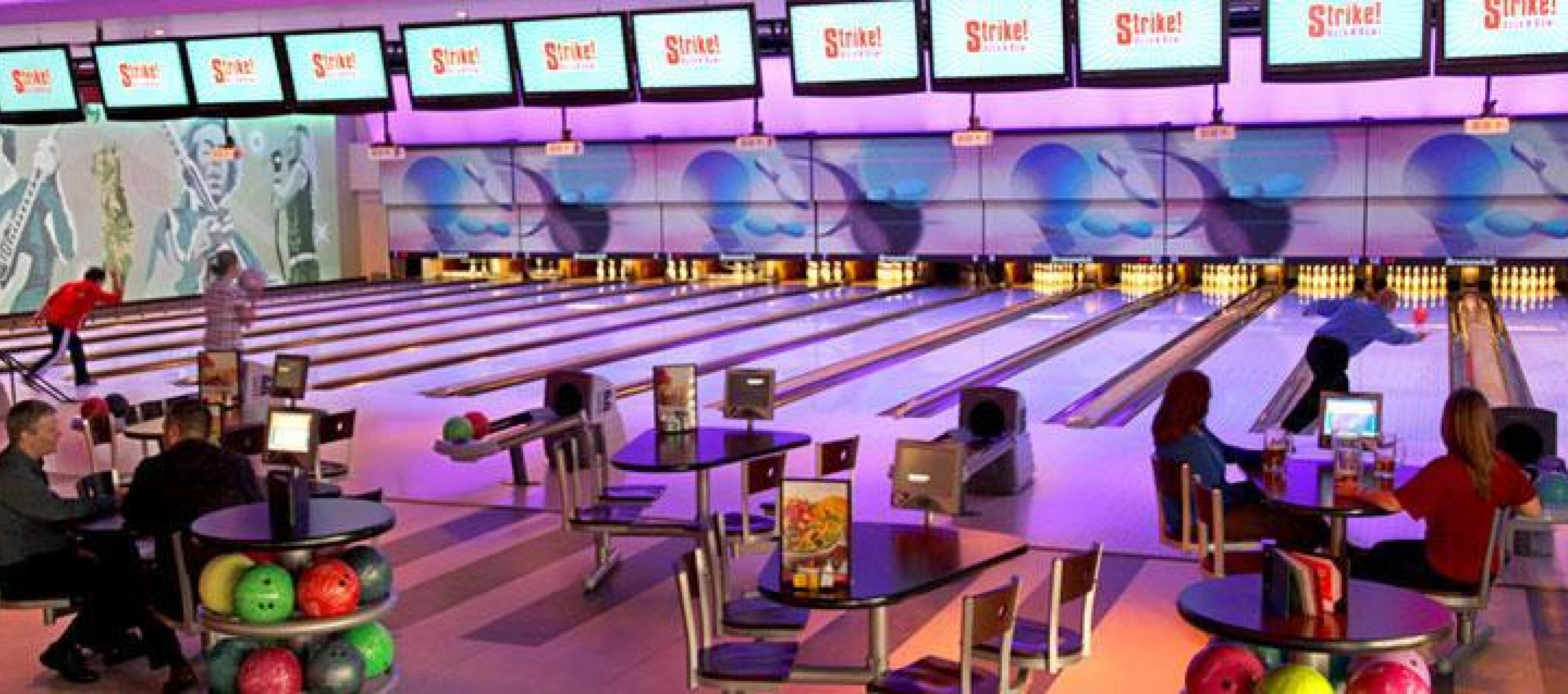Here you'll find 14 full size 10 pin bowling lanes, a high-def audio/visual system, intelligent LED lane lighting and touch screen monitors for easy, automated scoring. Plus, with special bumper-rails that can be raised or lowered for each player, kids and novice bowlers don't have to throw gutter balls.